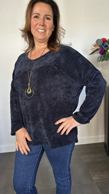 Sweater van zachte babyrib stof met vleermuismouw en gratis ketting. Valt achter langer dan voor.