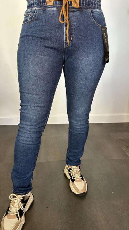 Hoog model jeans met fijne stretch met 2 zakken voor en achter. Valt ruim boven de navel! Recht model met strakke broekspijpen.