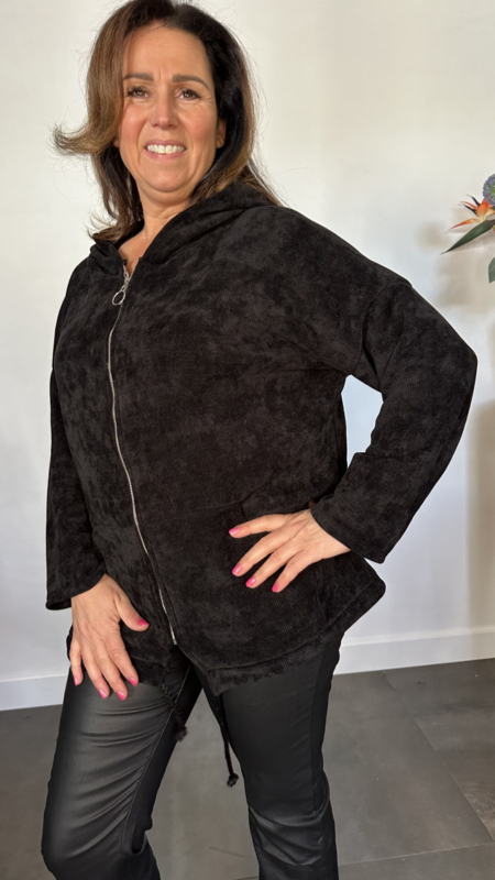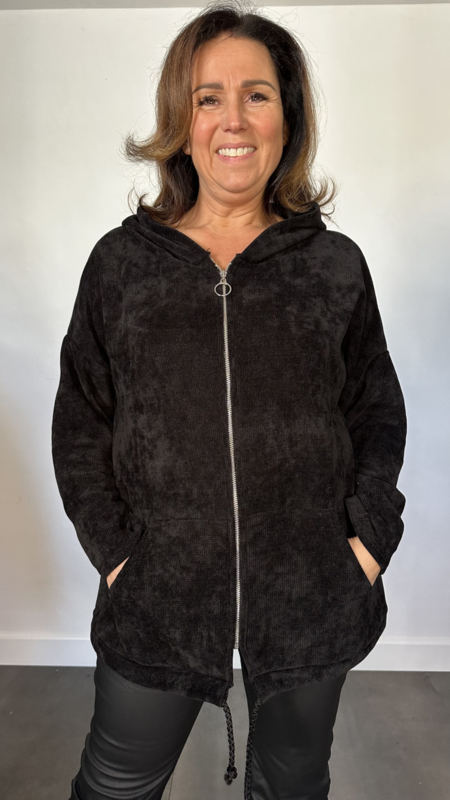 Sportief vest van zachte velvet baby rib stretch stof met ritssluiting, een capuchon en 2 fijne zakken aan de voorkant.