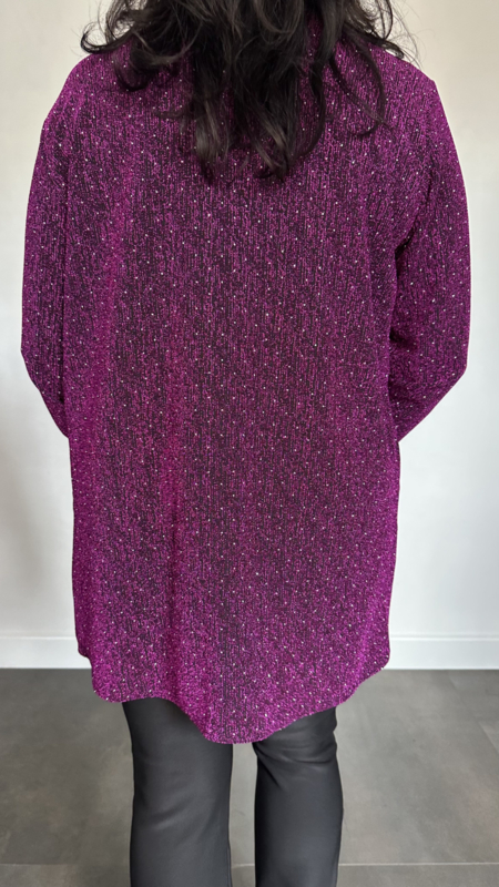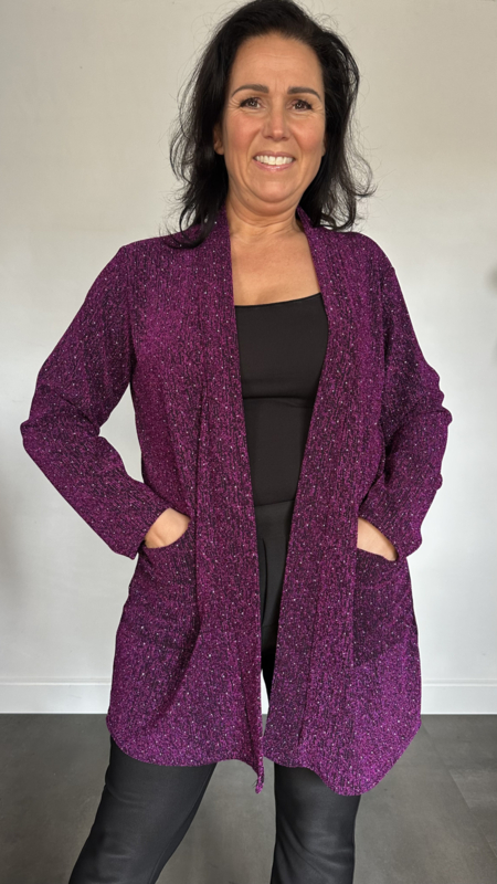 Vestje van soepel vallende glitter stretch stof. Bezaaid met glittersteentjes Dit vestje draag je los en het heeft 2 zakken aan de voorkant. (Geen garantie op de steentjes).