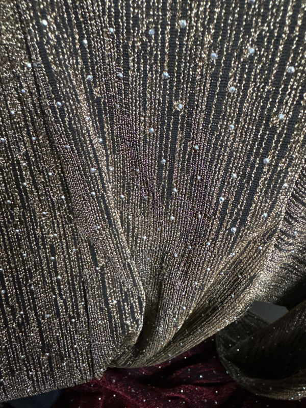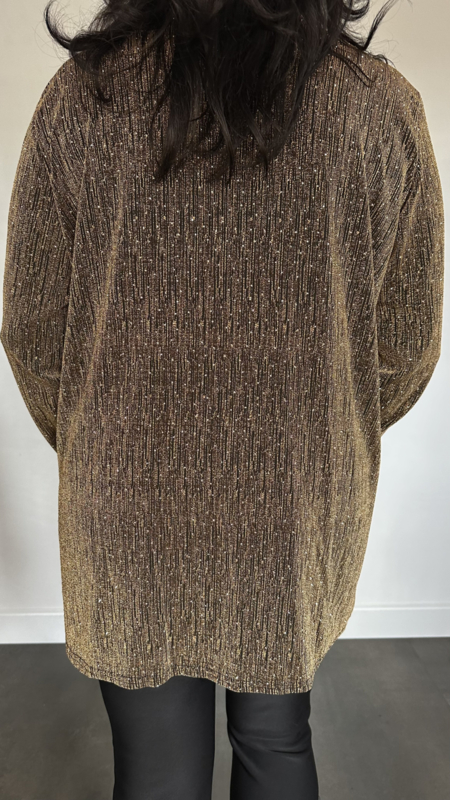 Vestje van soepel vallende glitter stretch stof. Bezaaid met glittersteentjes Dit vestje draag je los en het heeft 2 zakken aan de voorkant. (Geen garantie op de steentjes).