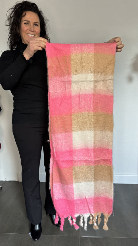 Deze knusse sjaal wikkelt je in zachtheid. Kleurrijke blokken vloeien in elkaar over terwijl gevlochten flosjes aan de randen dansen bij elke beweging. Warmte, stijl en speelsheid in één accessoire. Prikt niet en is door de kleurencombinatie verassend makkelijk te combineren.