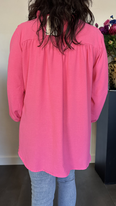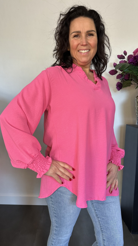 Crepe blouse met ruche langs de v-hals en gesmokte boorden onderaan de mouwen.