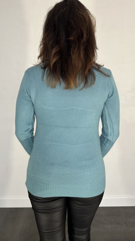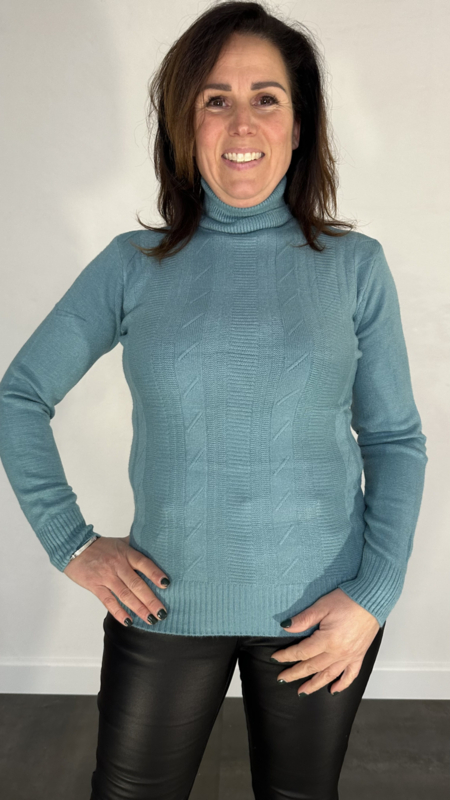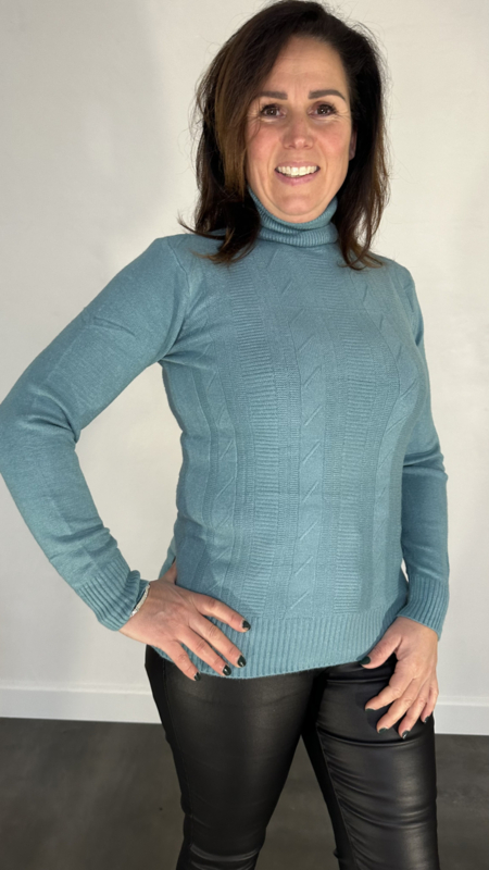 Gebreide coltrui met kabel patroon aan de voor kant.