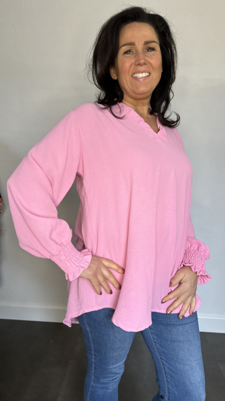 Crepe blouse met ruche langs de v-hals en gesmokte boorden onderaan de mouwen.