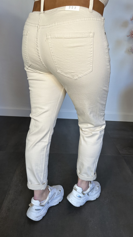 High waist jeans van stevige stretch stof. Hoog vallend model MOM fit/ Boyfriend met 2 zakken voor en achter. Valt ruim boven de navel. Met de omslag heeft deze broek een 7/8e lengte. Wordt geleverd met gratis riem. LET OP: Bij eventueel retour sturen dient de riem mee terug gestuurd te worden, ander kunnen wij de broek niet aan u terug betalen.