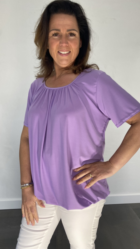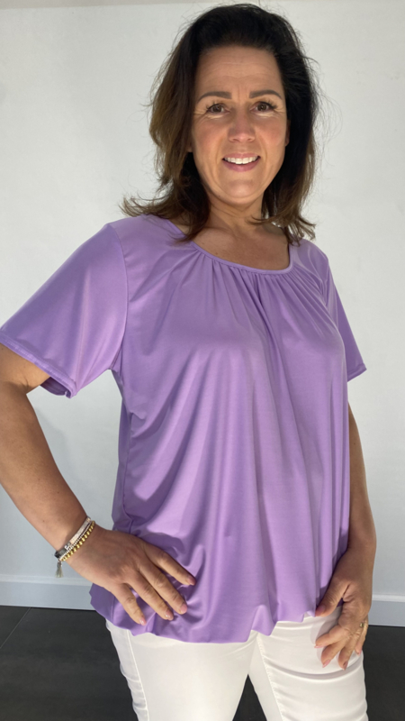 Ballon top met elastiek onderin , gemaakt van soepele gladde stretch stof, met korte mouw.