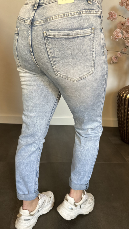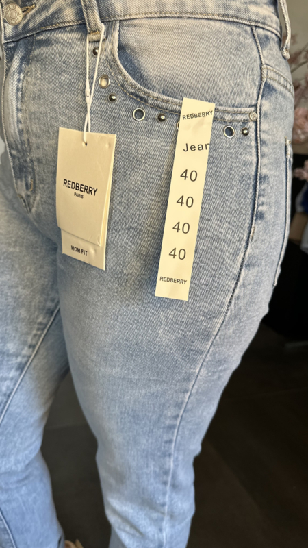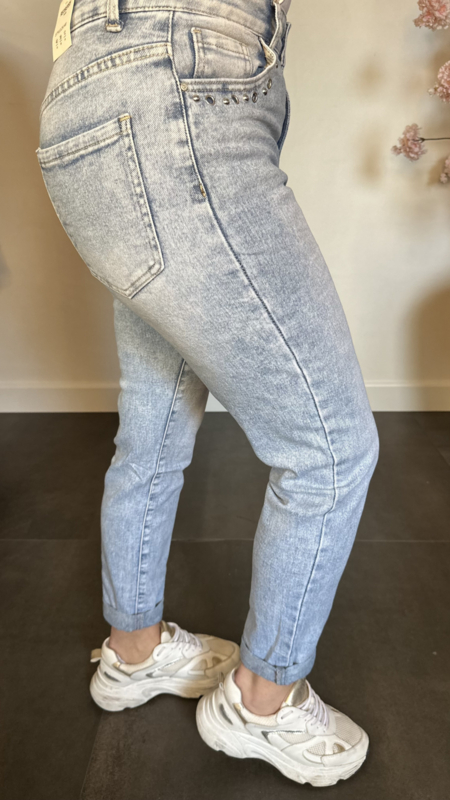 High waist jeans van stevige stretch stof in mom fit model. Hoog vallend model met 2 zakken voor en achter. Valt boven de navel. De broek is aan de voorkant bewekrt met studs langs de zakken.