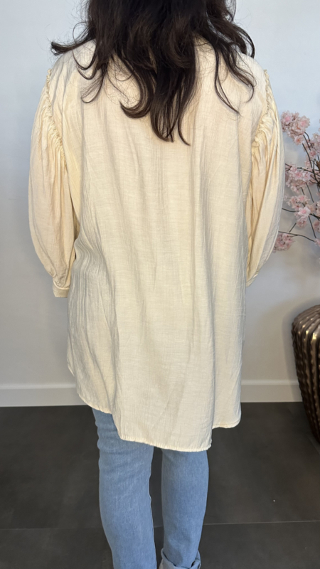 De blouse heeft stijlvolle pofmouwen en een comfortabele doorknoopsluiting, waardoor hij perfect is voor zowel casual als geklede gelegenheden. Het model valt achter iets langer dan voor, wat zorgt voor een speels en modern effect én een mooie pasvorm