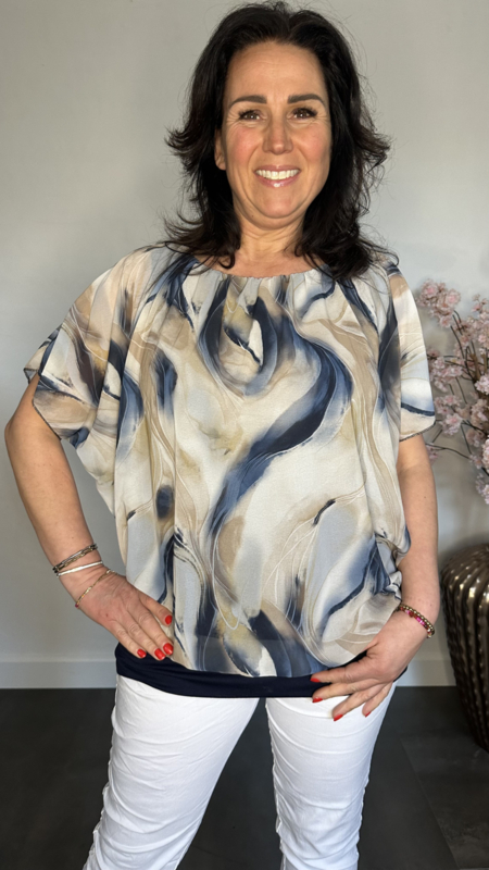 Voile blouse met elastische boord en korte mouw. Deze blouse is gevoerd met een tricot ondertop die vast zit aan de blouse.