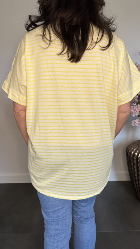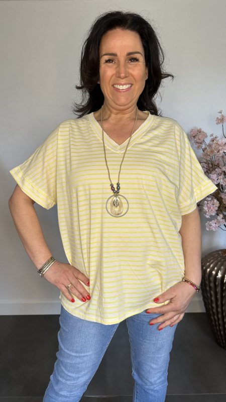 T-shirt van gestreepte stretch stof met v-hals +gratis ketting. Valt achter langer dan voor.