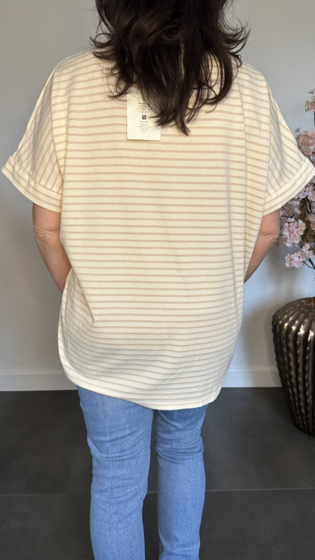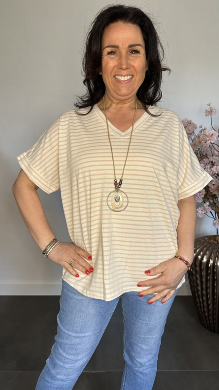 T-shirt van gestreepte stretch stof met v-hals +gratis ketting. Valt achter langer dan voor.