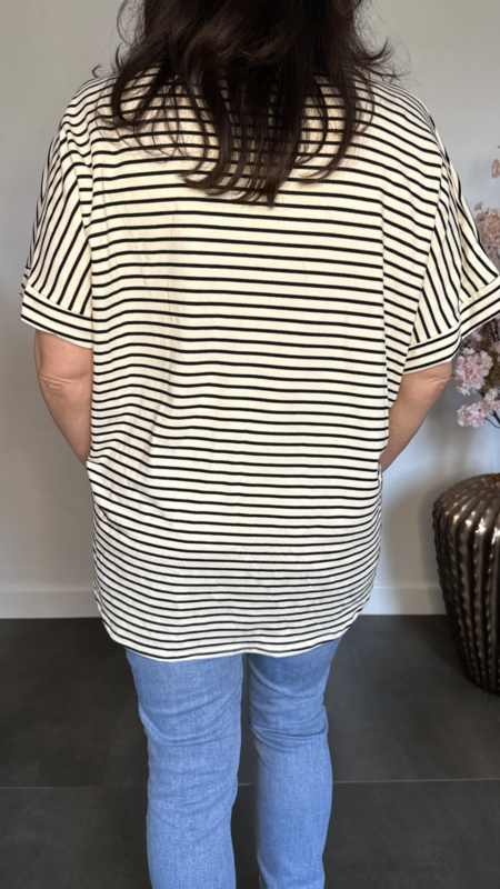 T-shirt van gestreepte stretch stof met v-hals +gratis ketting. Valt achter langer dan voor.