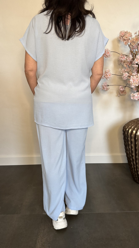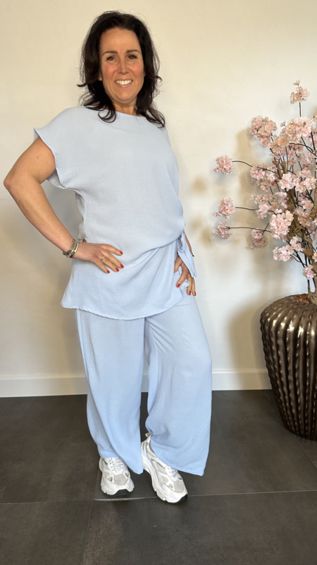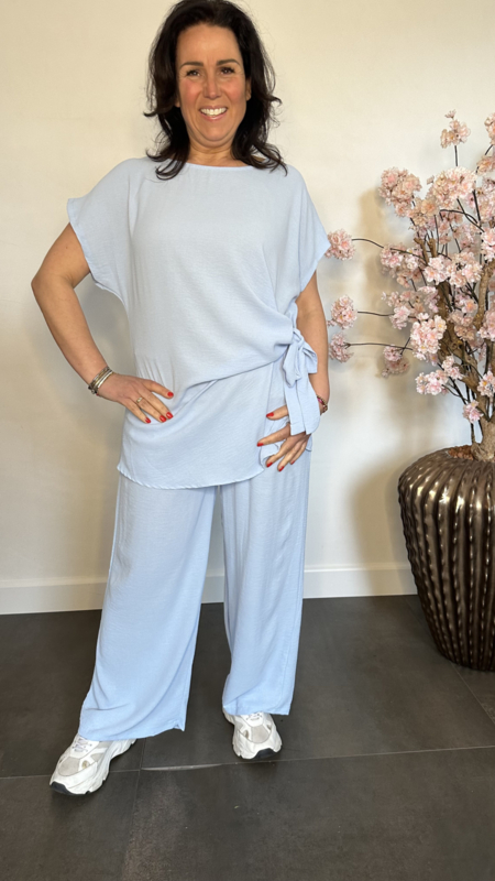 2-Delig pak gemaakt van soepele crepe stof. De broek heeft een elastische tailleband en 2 zakken. De top valt mooi lang en heeft een strik aan de zijkant
