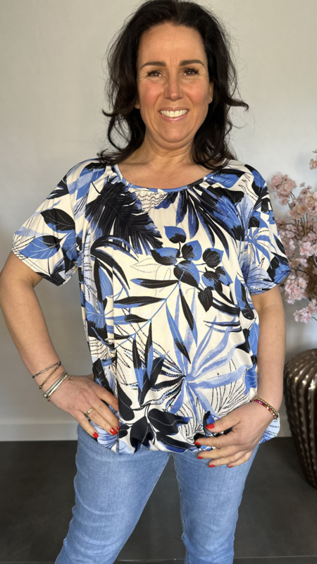 Ballon shirt met elastiek Palm Leaves blauw/wit