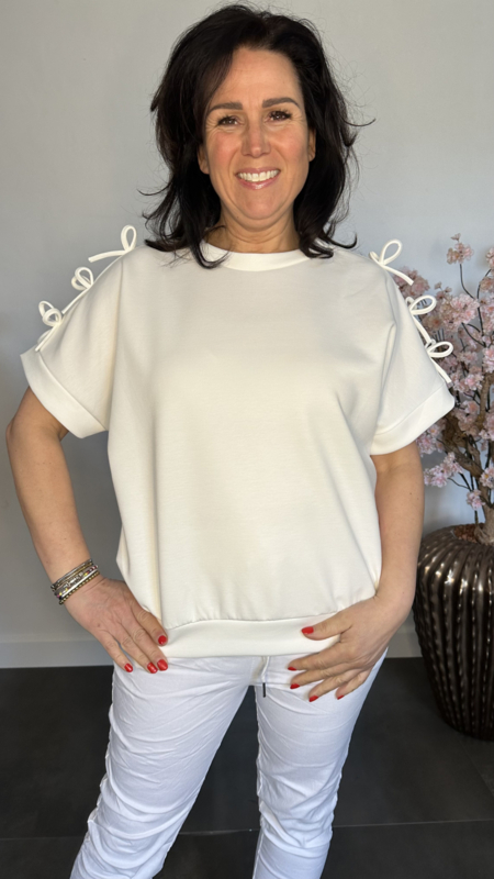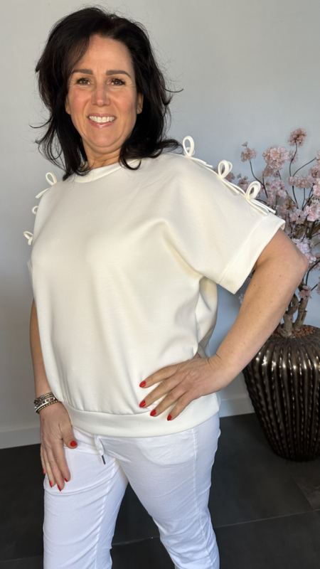 Op zoek naar een comfortabele maar toch vrouwelijk shirt? Dit sporty sweatshirt met schattige strikjes op de korte mouw is dé perfecte combinatie van casual en trendy 💕Het shirt heeft een ronde hals een boord onderaan en tussen de strikjes zitten speelse openingen.
