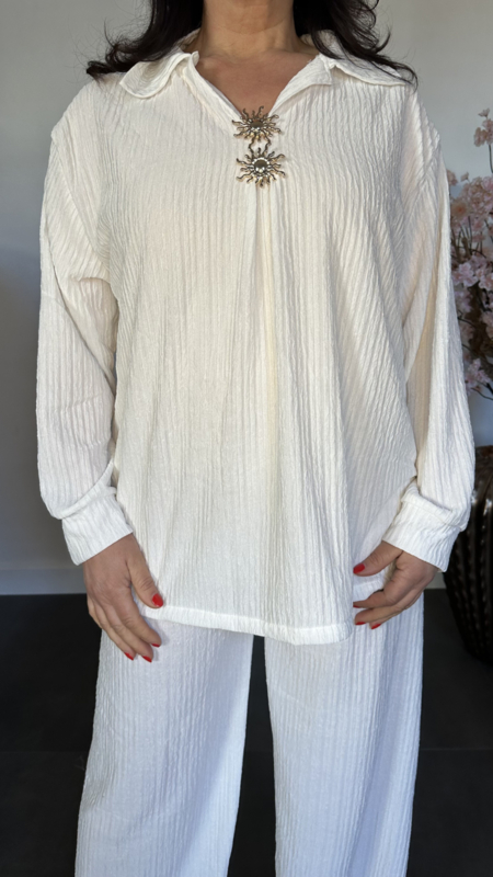 2-Delig comfy pak van een soepel vallende stretch stof met grove ribbel. Het shirt heeft een kraagje met een splitjein de halslijn en 2 goudkleurige broches, de broek heeft wijde pijpen en een elastische tailleband. (Broches zijn speldjes deze adviseren wij met wassen te verwijderen)
