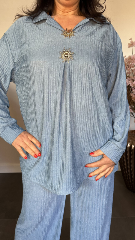 2-Delig comfy pak van een soepel vallende stretch stof met grove ribbel. Het shirt heeft een kraagje met een splitjein de halslijn en 2 goudkleurige broches, de broek heeft wijde pijpen en een elastische tailleband. (Broches zijn speldjes deze adviseren wij met wassen te verwijderen)