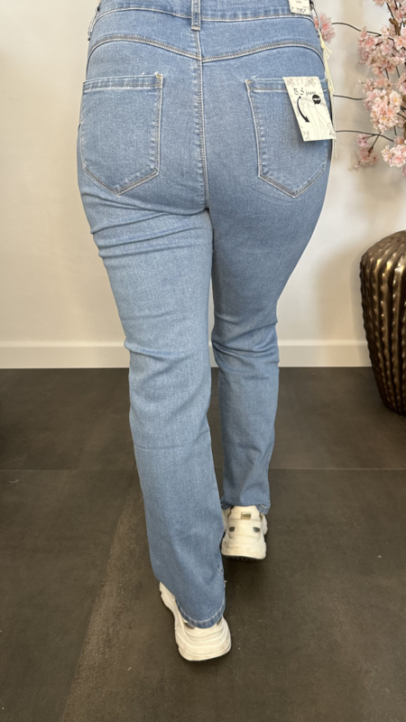 Hoog model jeans met fijne stretch in een lichte jeans kleur. Dit model valt hoog boven de navel en heeft 2 zakken voor en achter en heeft rechte broekspijpen.