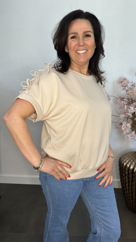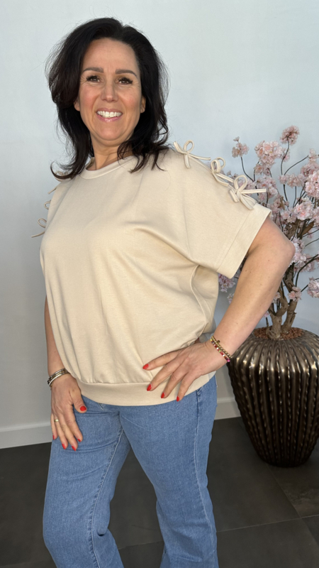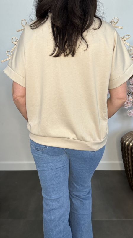 Op zoek naar een comfortabele maar toch vrouwelijk shirt? Dit sporty sweatshirt met schattige strikjes op de korte mouw is dé perfecte combinatie van casual en trendy 💕Het shirt heeft een ronde hals een boord onderaan en tussen de strikjes zitten speelse openingen.