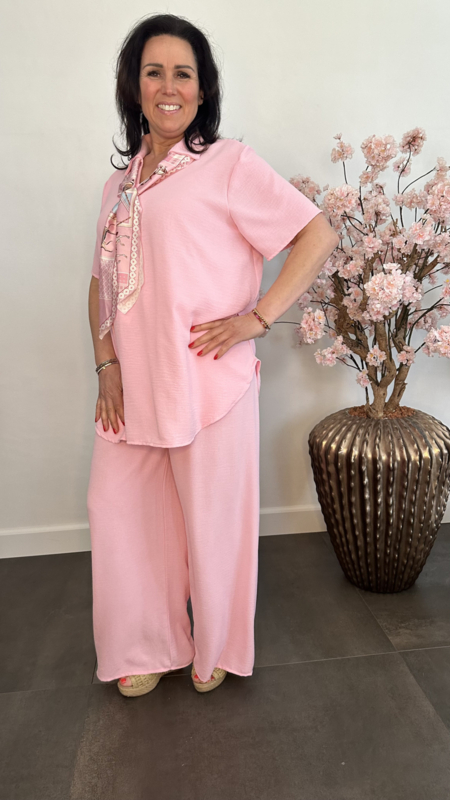 2-Delig pak gemaakt van soepele crepe stof. De top valt mooi lang en loopt rond aan de onderkant. De top heeft een v-hals met kraagje en een bijpassend sjaaltje. De broek heeft wijde broekspijpen een elastische tailleband met ook daar een bijpassend sjaaltje.