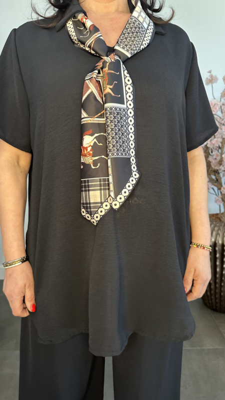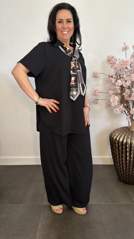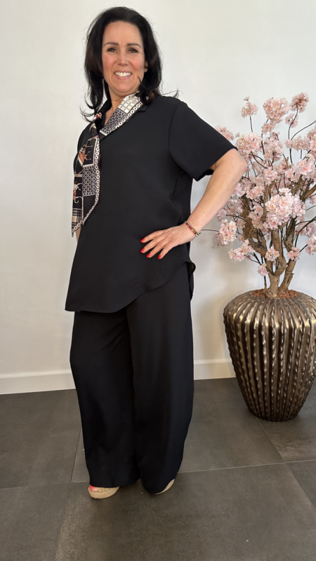 2-Delig pak gemaakt van soepele crepe stof. De top valt mooi lang en loopt rond aan de onderkant. De top heeft een v-hals met kraagje en een bijpassend sjaaltje. De broek heeft wijde broekspijpen een elastische tailleband met ook daar een bijpassend sjaaltje.