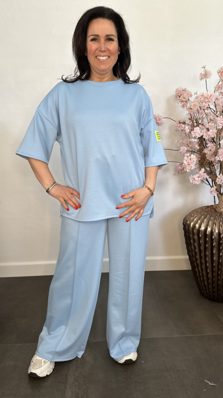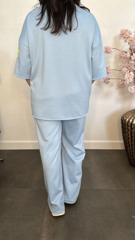 Artikelnummer: CPD 10 ijsblauw LABEL: geelClassy 2-delig comfy pak. Bestaande uit een shirt met korte mouw en een broek met elastische tailleband en wijde pijpen met een naad over de broekpijpen voor een stijlvolle look en 2 praktische zakken. Het shirt valt achter iets langer dan voor en heeft 2 kleine splitjes in de zijnaden. Met zowel op de broek een fluoriserend tekstlabel met de tekst:" Life isn't perfect but your outfit can be." In de broek zit een bijpassend koord in de tailleband in de kleur van het label.