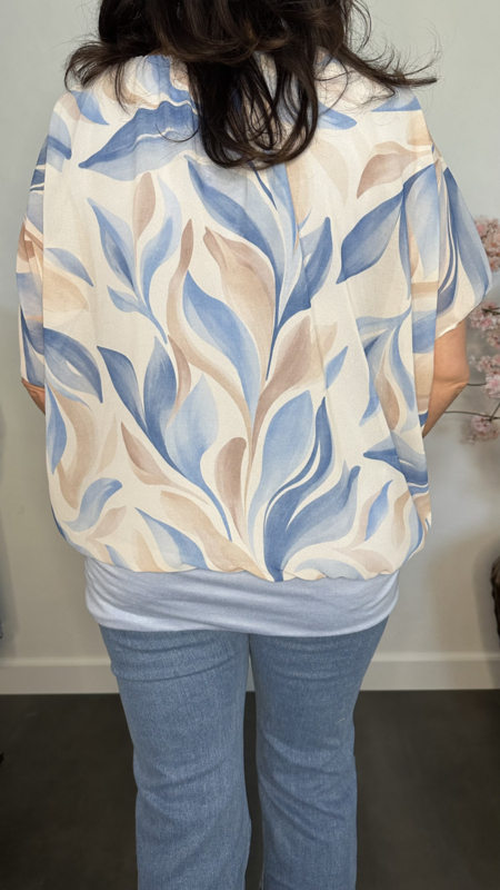 Voile blouse met elastische boord en korte mouw. Deze blouse is gevoerd met een tricot ondertop die vast zit aan de blouse.