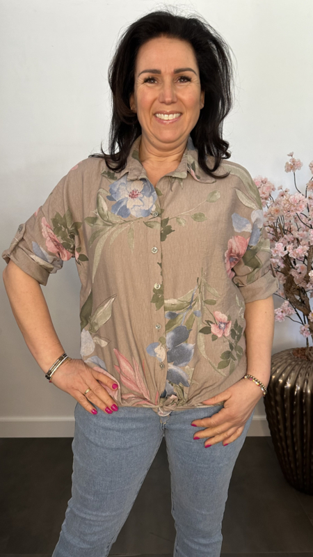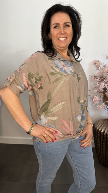 Blouse gebloemd met knoop Taupe