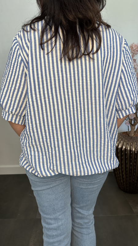 Shirt gemaakt van katoenen linnenlook stof met v-hals en elastiek onderin. Geleverd met gratis ketting.
