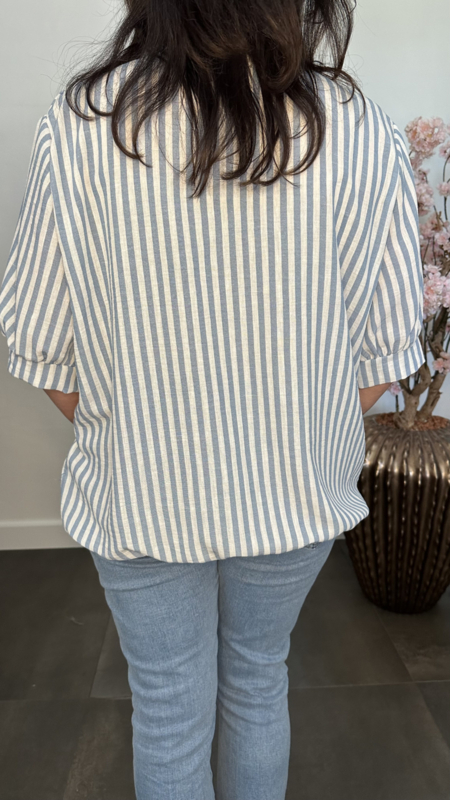 Shirt gemaakt van katoenen linnenlook stof met v-hals en elastiek onderin. Geleverd met gratis ketting.