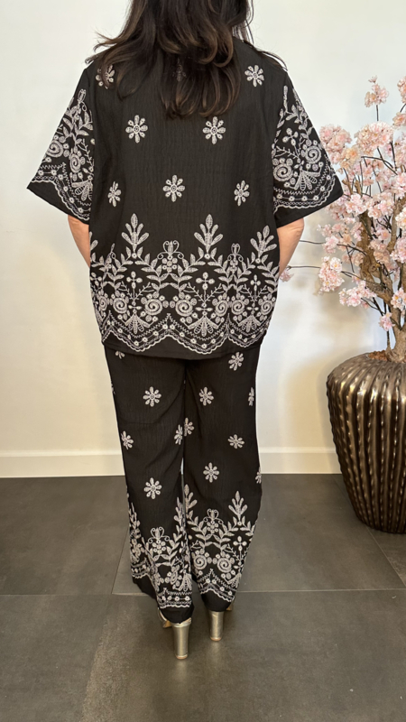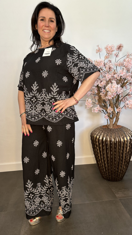 Artikelnummer: 8522-Delig pak Nova is gemaakt van een viscose/katoen mix met een luchtige linnen look. De set is versierd met speelse, geprinte borduursels die zorgen voor een zomerse uitstraling.
