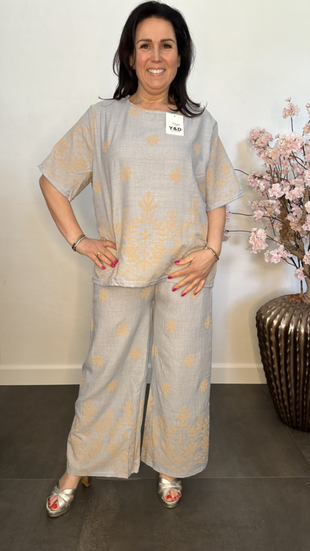 Artikelnummer: 8522-Delig pak Nova is gemaakt van een viscose/katoen mix met een luchtige linnen look. De set is versierd met speelse, geprinte borduursels die zorgen voor een zomerse uitstraling.