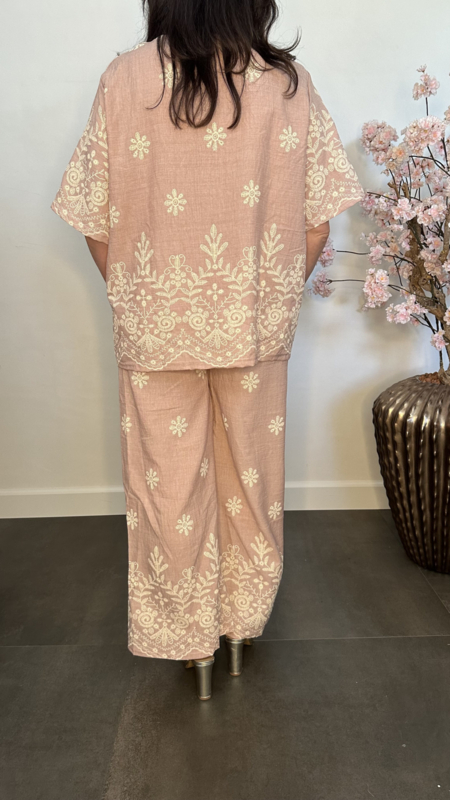 Artikelnummer: 8522-Delig pak Nova is gemaakt van een viscose/katoen mix met een luchtige linnen look. De set is versierd met speelse, geprinte borduursels die zorgen voor een zomerse uitstraling.