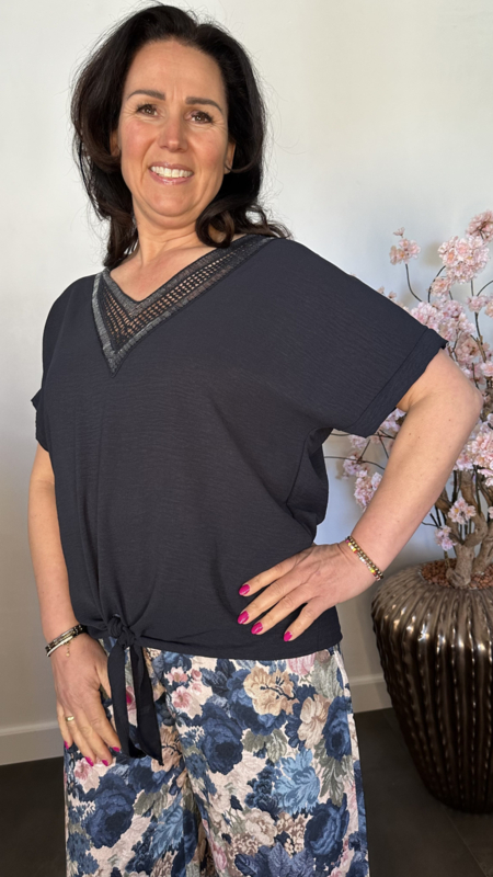 Top met knoop onderin gemaakt van soepele crepe stof. Met korte vleermuismouwen. De v-hals is afgezet met kant en pailletten.