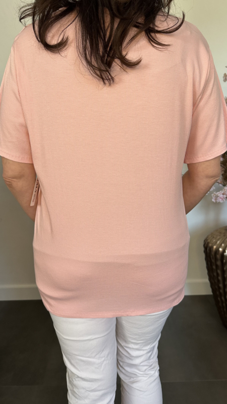 Shirt gemaakt van zachte ribbel stretch stof met kanten inzet in de V-hals. Draagt heerlijk luchtig, ideaal voor de zomerse dagen.