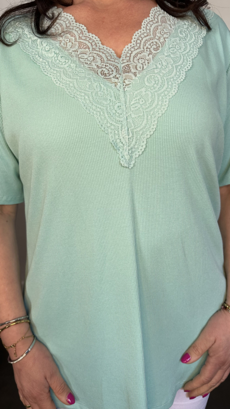 Shirt gemaakt van zachte ribbel stretch stof met kanten inzet in de V-hals. Draagt heerlijk luchtig, ideaal voor de zomerse dagen.