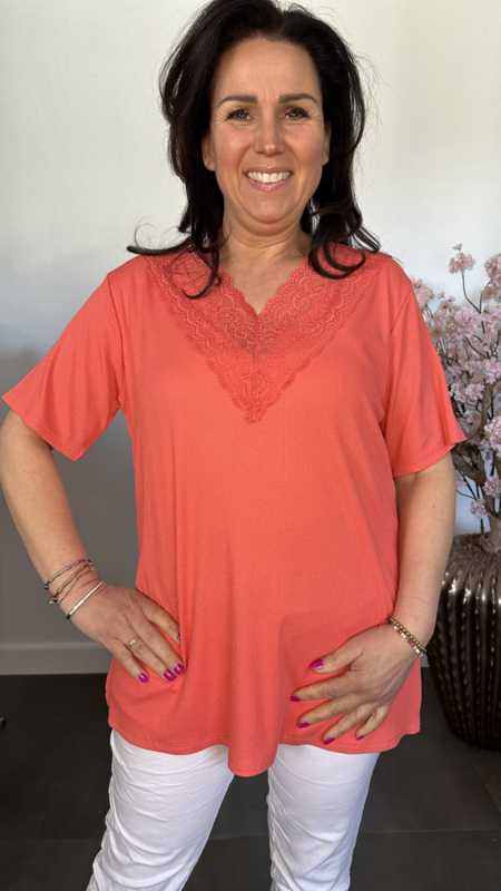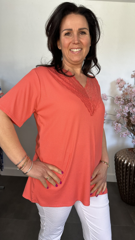 Ribbel shirt met kanten V-hals Koraal