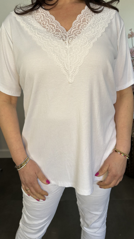 Ribbel shirt met kanten V-hals Wit