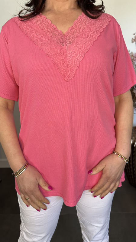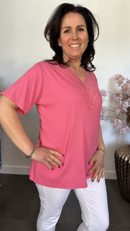 Ribbel shirt met kanten V-hals Fuchsia