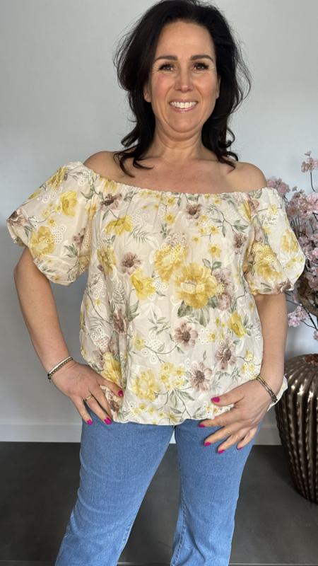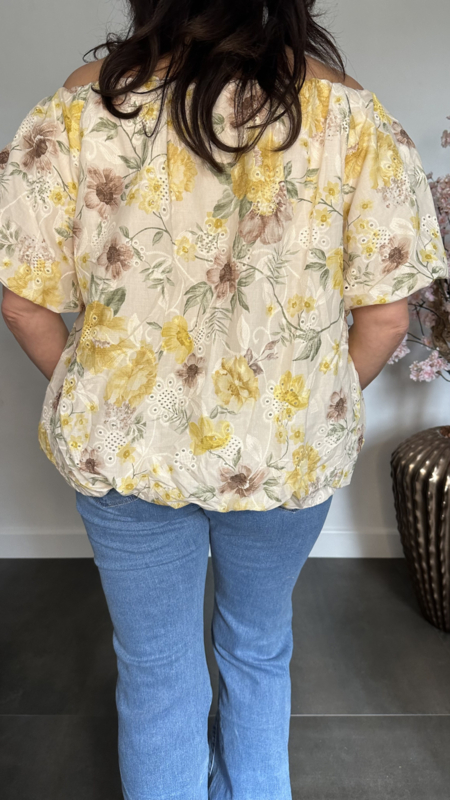 Broderie ballon blouse gebloemd Geel