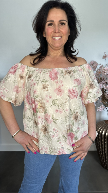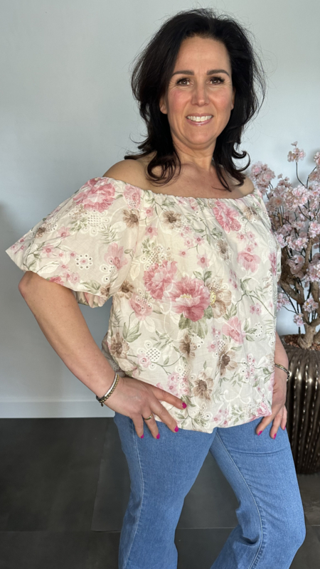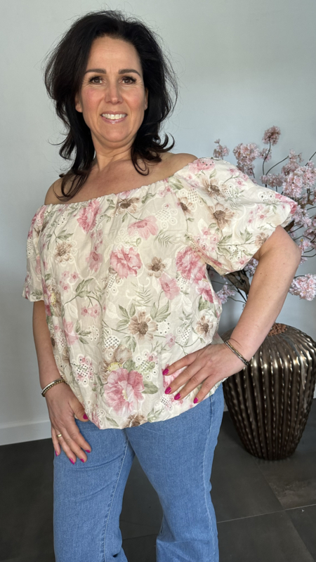 Prachtige broderie ballon blouse met bloemen print. Gemaakt van 100%katoen en daardoor heerlijk luchtig met dragen. De blouse is gevoerd en schijnt niet door. Met pofmouw en elastiek in de halslijn waardoor je deze gemakkelijk off shoulder te dragen is.