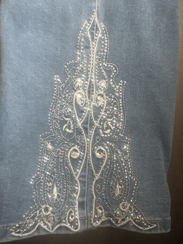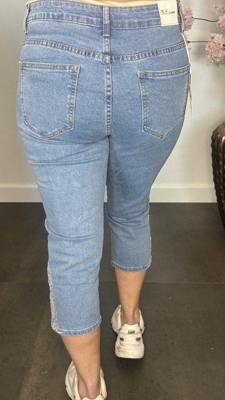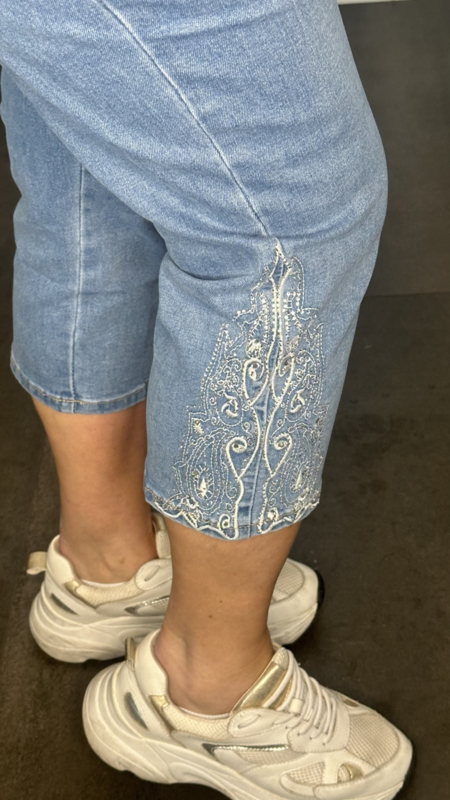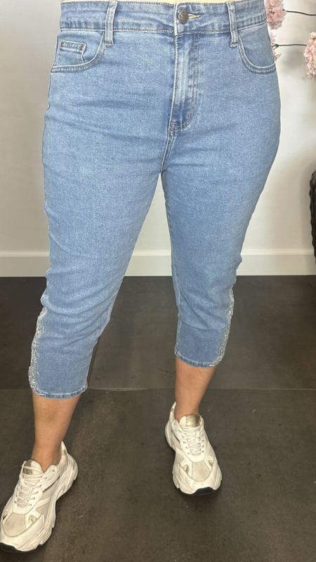 High waist Capri stretch jeans. Hoog model met borduursel en zilverkleurig glitter aan de zijkant van de broekspijp. (Geen garantie op de glitters)