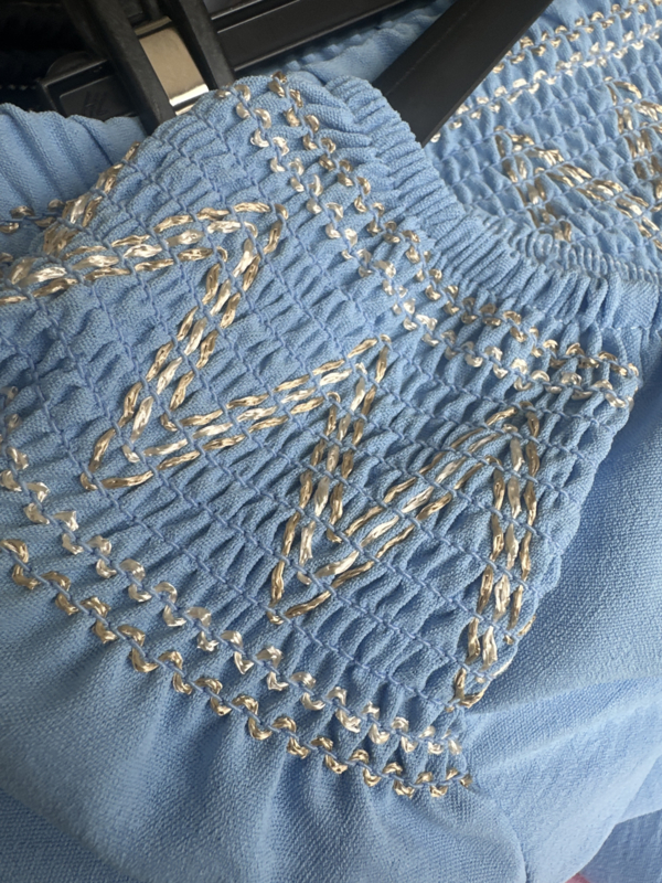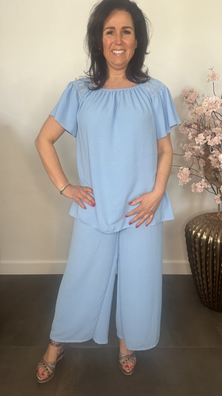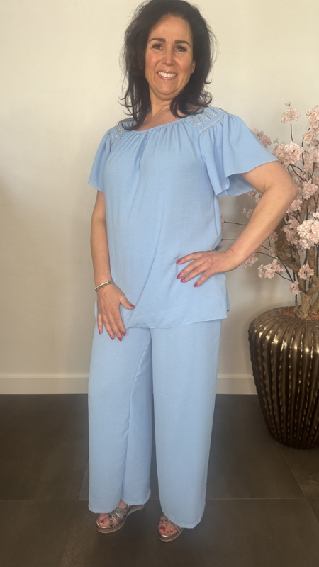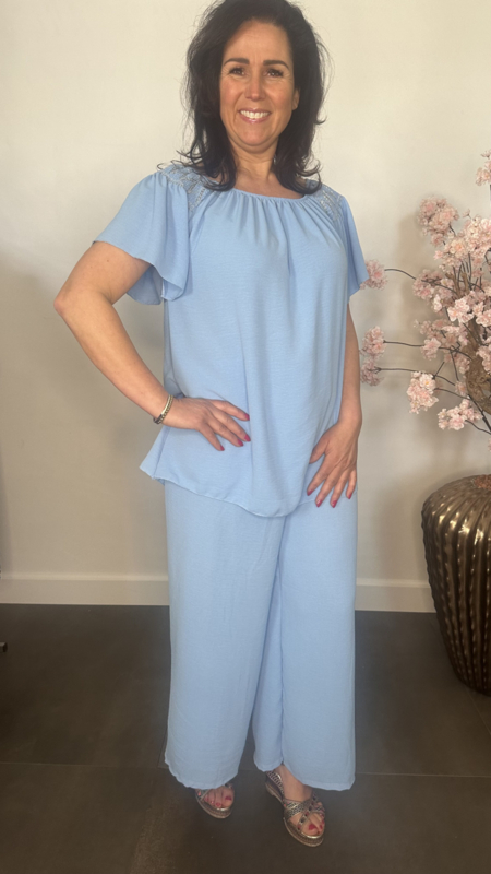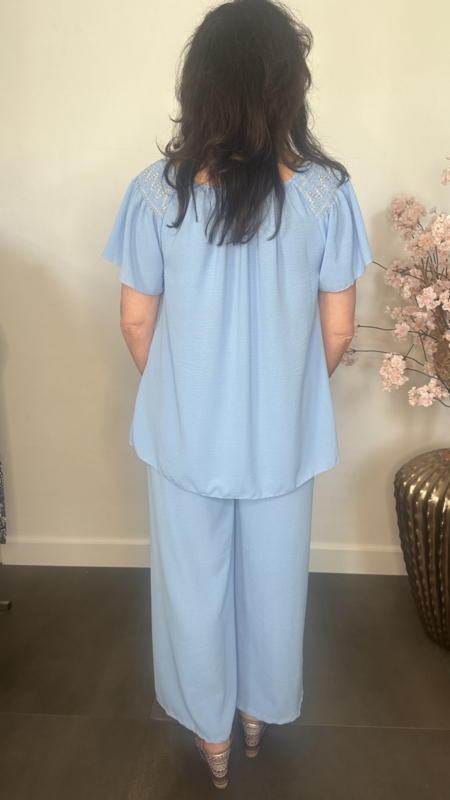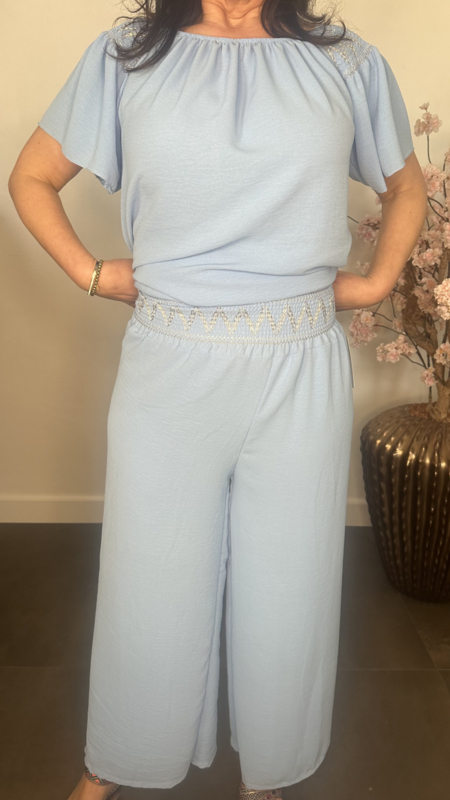 2-Delig pak gemaakt van soepele crepe stof. De broek heeft een gesmokte tailleband versierd met stiksels en wijde pijpen. De top valt mooi lang en is op de schouders gesmokt met elastiek en versierd met stiksels. Door het elastische /gesmokte detail op de schouder is deze top ook gechikt om off sholder te dragen.