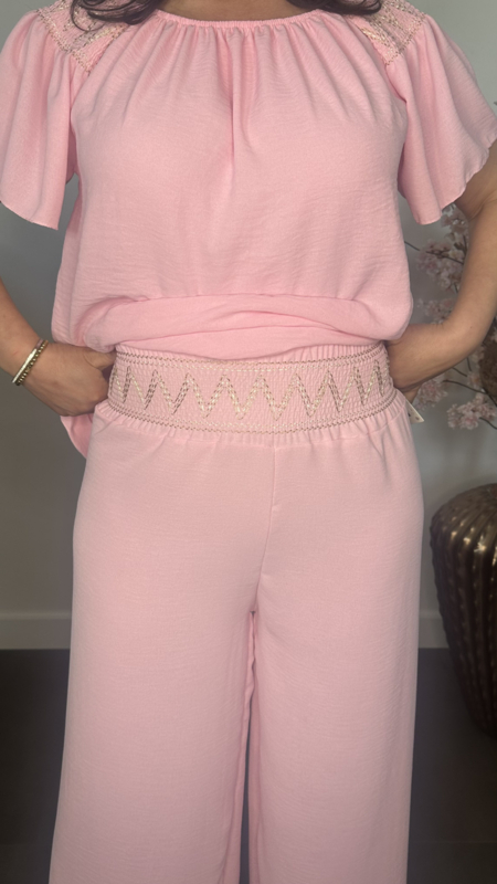 2-Delig pak gemaakt van soepele crepe stof. De broek heeft een gesmokte tailleband versierd met stiksels en wijde pijpen. De top valt mooi lang en is op de schouders gesmokt met elastiek en versierd met stiksels. Door het elastische /gesmokte detail op de schouder is deze top ook gechikt om off sholder te dragen.