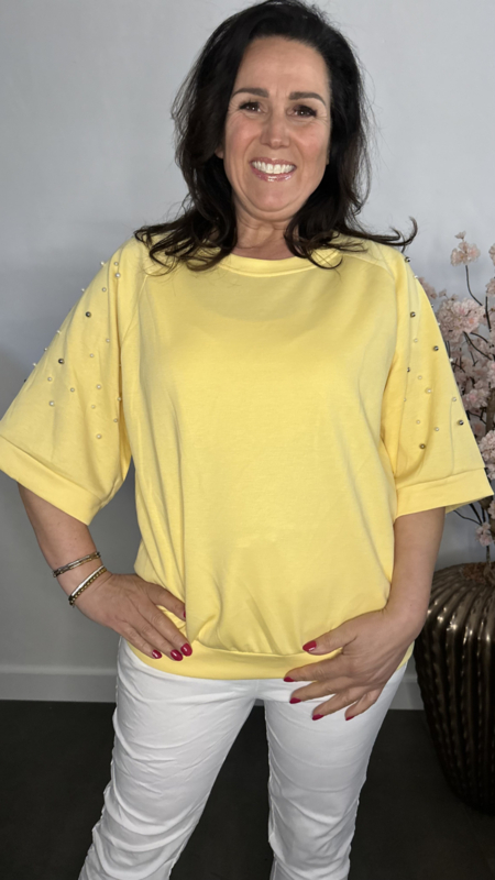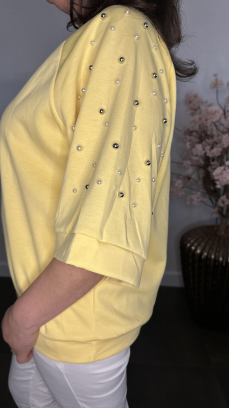 Dit sweatshirt met korte mouwen combineert comfort en klasse op een moeiteloze manier. De zachte joggingstof met stretch zorgt voor een fijne pasvorm, terwijl de verfijnde pareldetails een luxe en vrouwelijke touch toevoegen. Ideaal voor zowel een casual als dressed-up outfit. (Geen garantie op de parels).