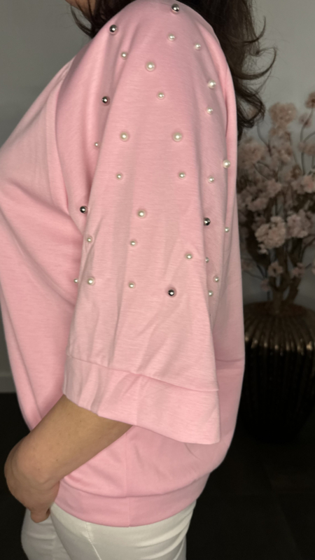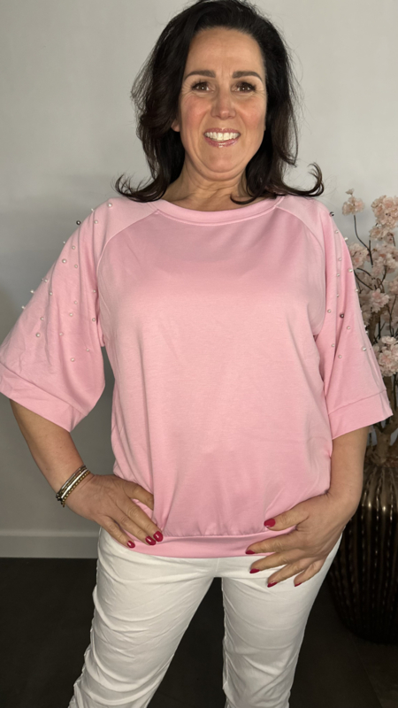 Dit sweatshirt met korte mouwen combineert comfort en klasse op een moeiteloze manier. De zachte joggingstof met stretch zorgt voor een fijne pasvorm, terwijl de verfijnde pareldetails een luxe en vrouwelijke touch toevoegen. Ideaal voor zowel een casual als dressed-up outfit. (Geen garantie op de parels).