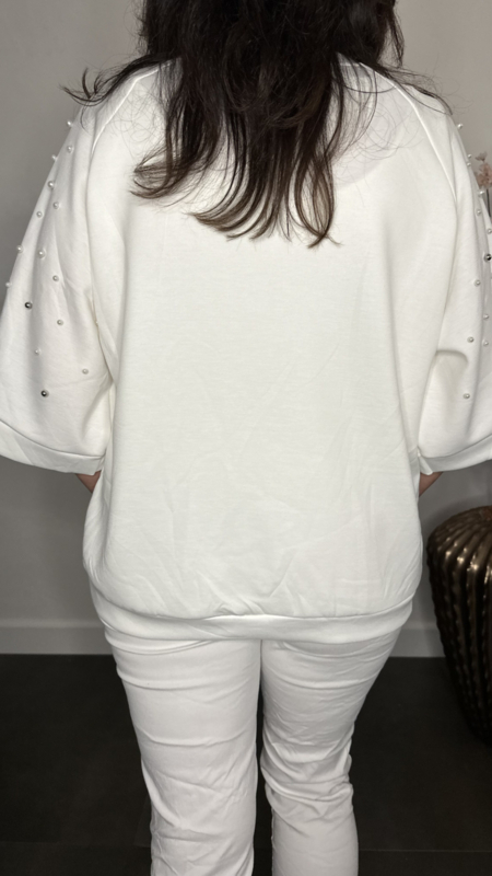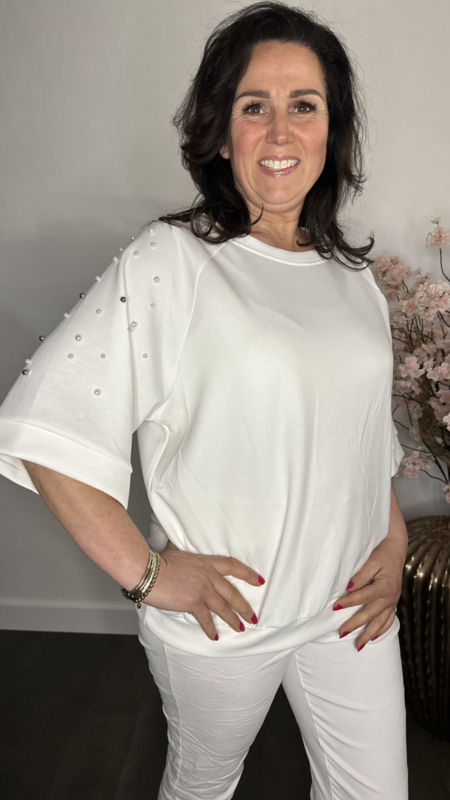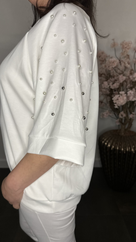 Dit sweatshirt met korte mouwen combineert comfort en klasse op een moeiteloze manier. De zachte joggingstof met stretch zorgt voor een fijne pasvorm, terwijl de verfijnde pareldetails een luxe en vrouwelijke touch toevoegen. Ideaal voor zowel een casual als dressed-up outfit. (Geen garantie op de parels).