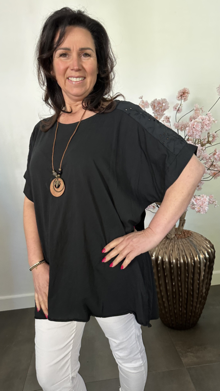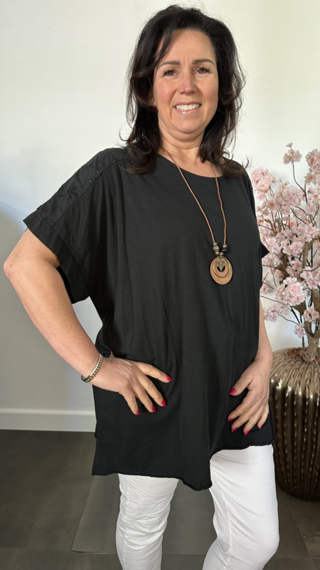 De verfijnde broderie inzet op de schouders en rug geeft het T-shirt een vrouwelijke en stijlvolle uitstraling met een subtiel speels effect. Ideaal om zowel casual te dragen als iets chiquer te stylen.