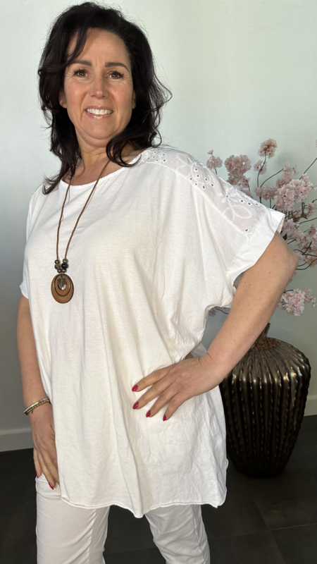 De verfijnde broderie inzet op de schouders en rug geeft het T-shirt een vrouwelijke en stijlvolle uitstraling met een subtiel speels effect. Ideaal om zowel casual te dragen als iets chiquer te stylen.